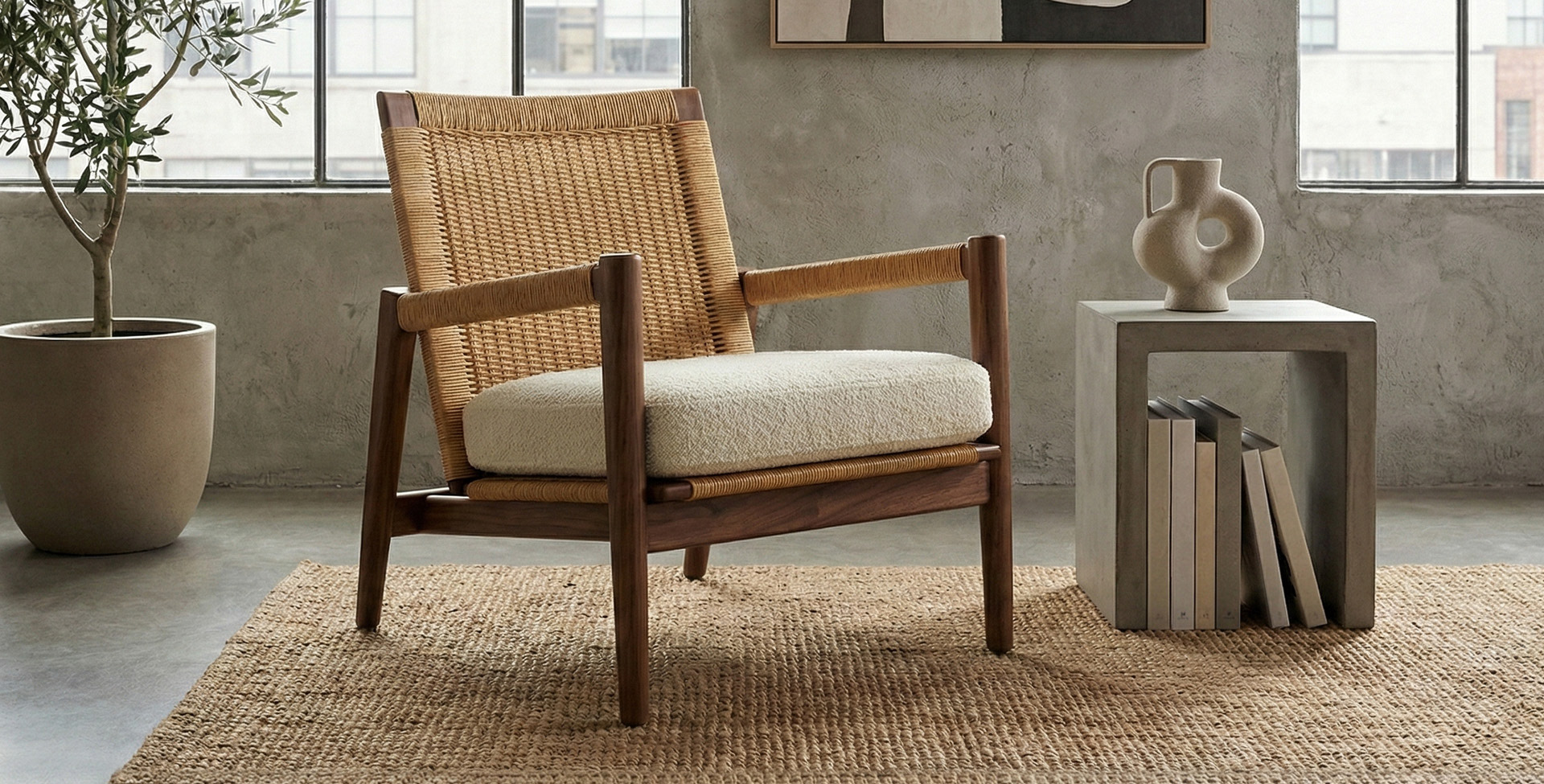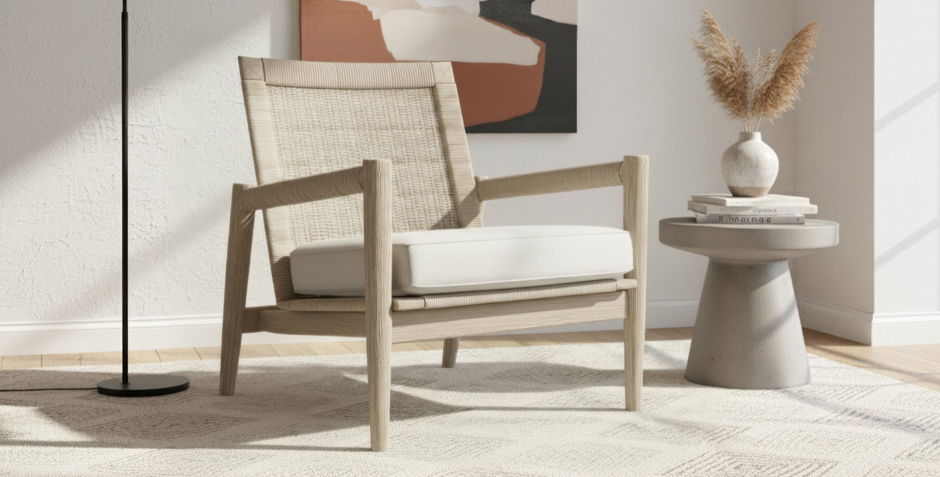 An accent chair defined by balance and poise — grounded in material unity yet marked by confident geometry. The design explores how angular structure and woven texture can create a sense of ease through proportion and material rhythm.