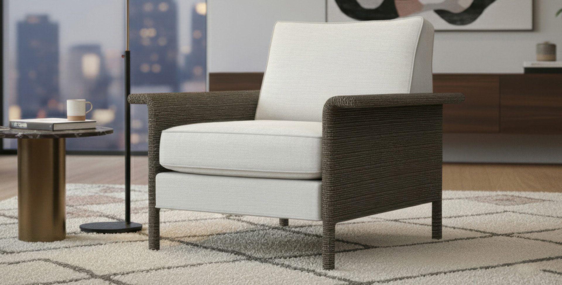 An accent chair defined by structure and comfort in equal measure. The concept centered on creating a singular, sculptural form — a frame expressed as one continuous surface wrapped in woven rope.