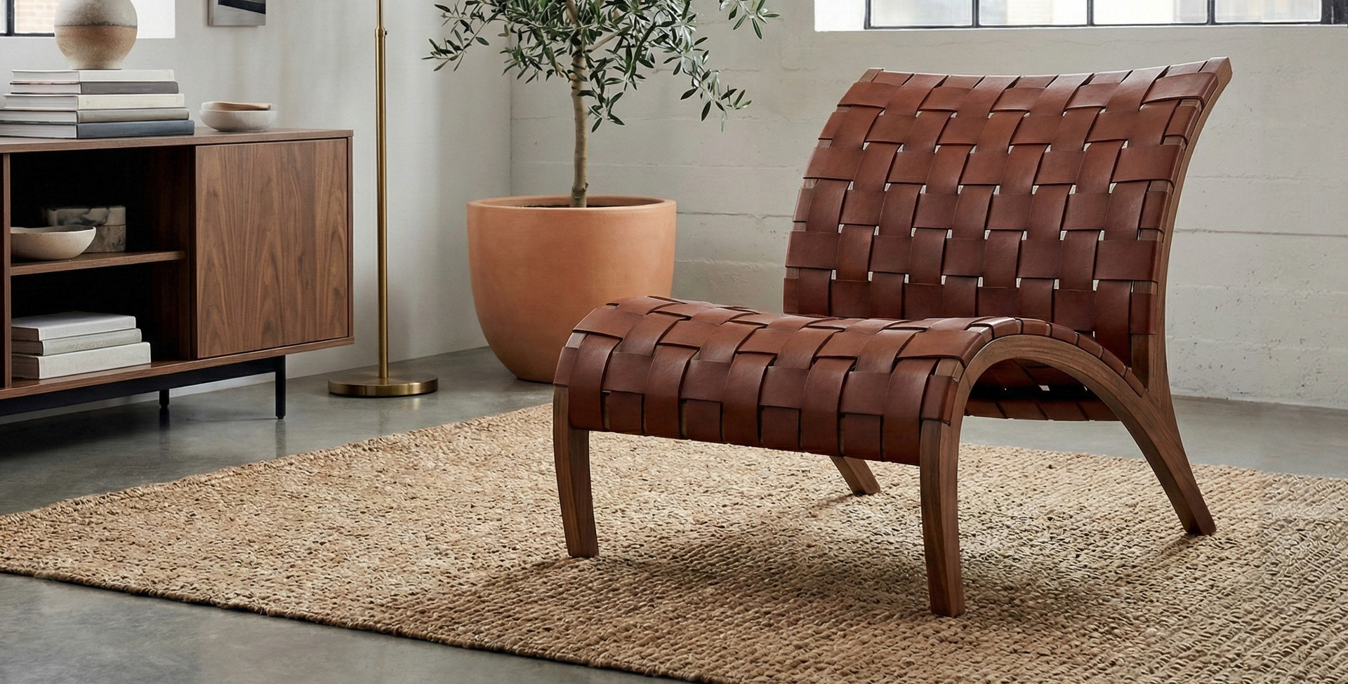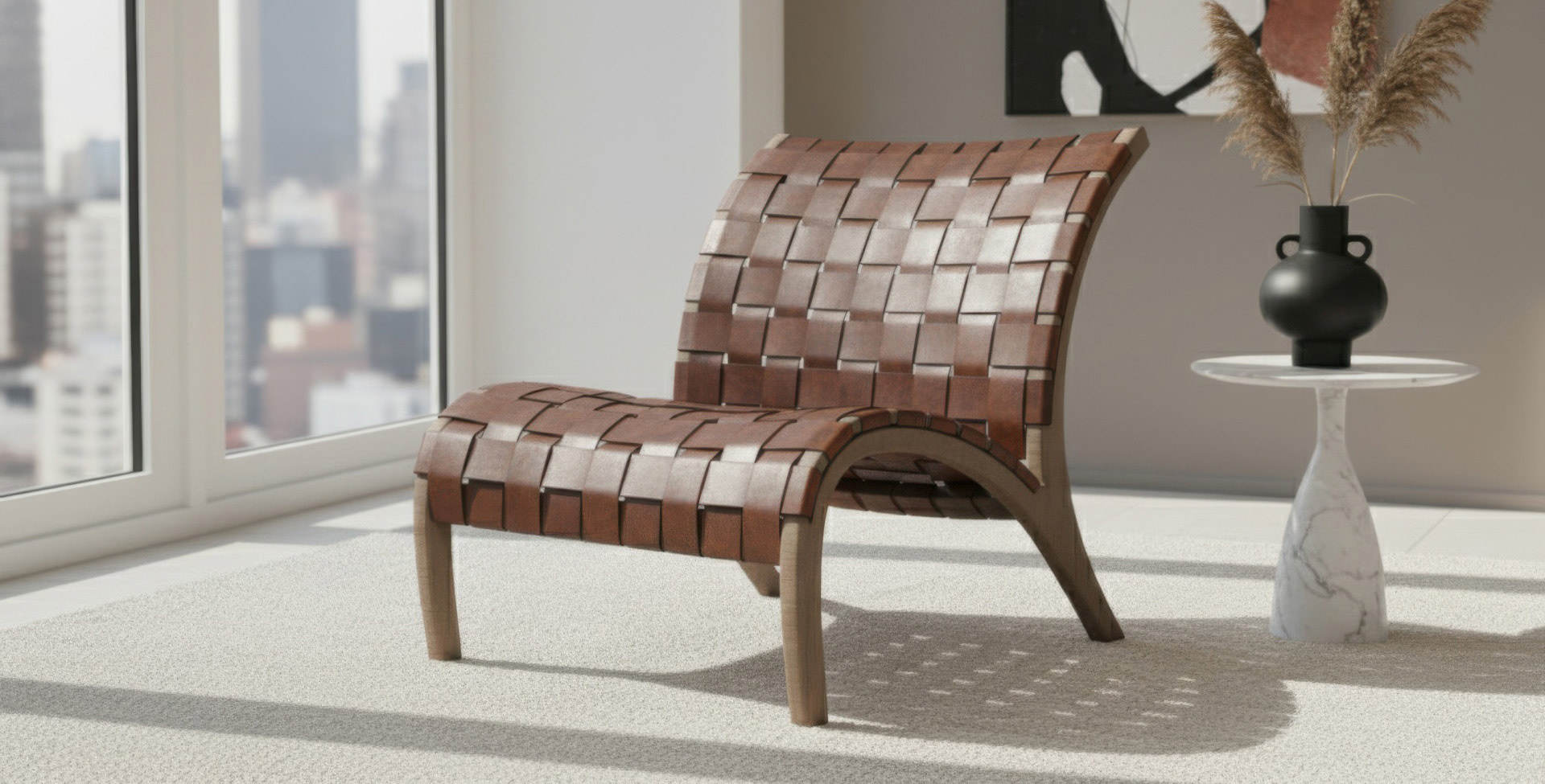 The frame is formed from segmented wood elements joined with concealed reinforcement, allowing the continuous arc to feel fluid yet grounded. Subtle curvature and stance reference natural motion without excess, suggesting lightness through structure. A woven leather seat and back add tactile contrast, complementing the chair’s quiet presence.