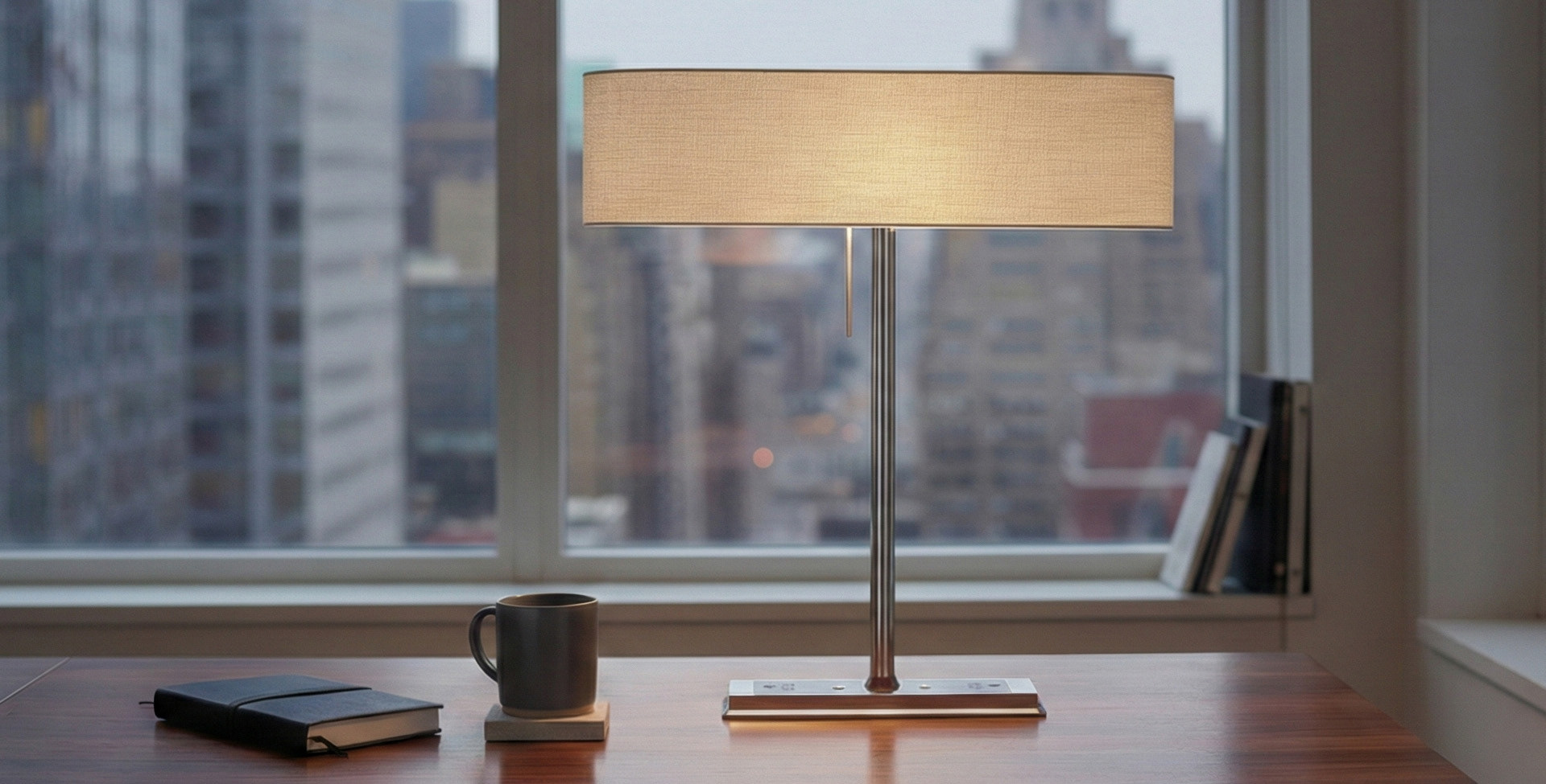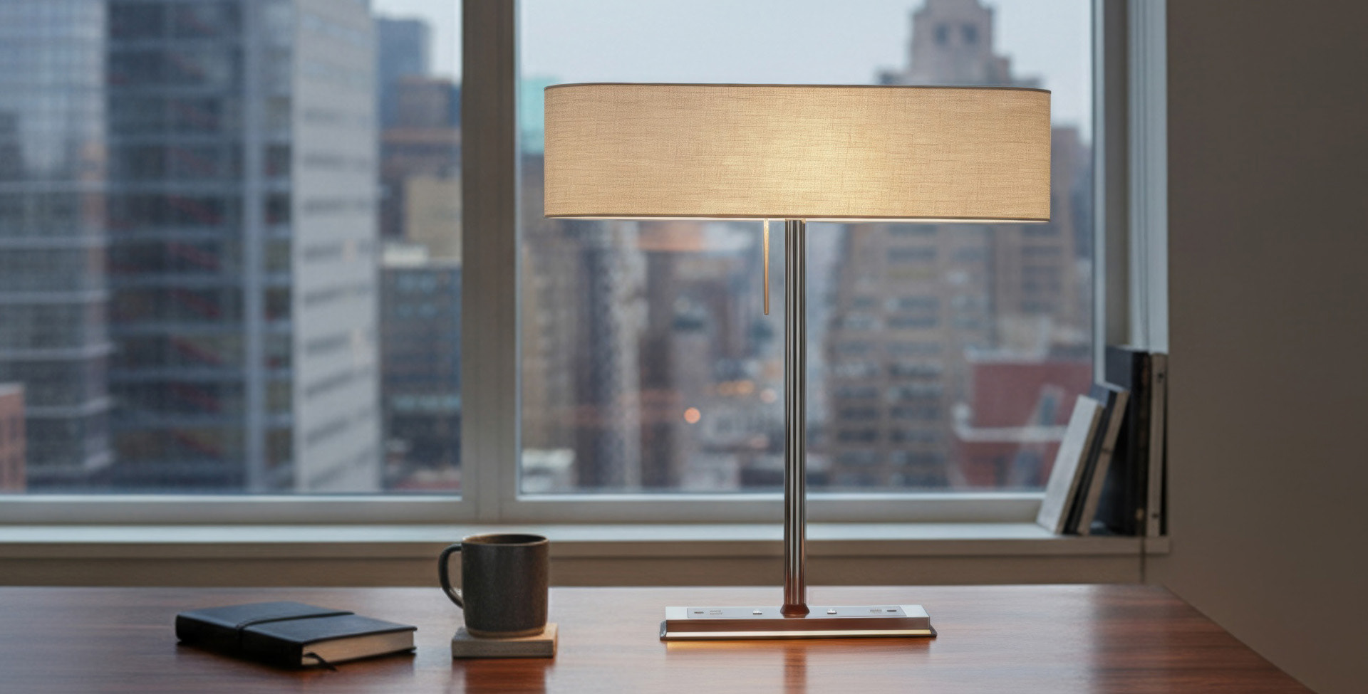 The design pairs a thin, elongated shade with a weighted rectangular base, creating visual balance and a grounded presence on the tabletop. Dual USB ports and two power outlets are integrated along the base for convenient access without visual distraction. By resolving form and function, the lamp contributes quietly to the spatial experience and daily rhythm of the guest room.